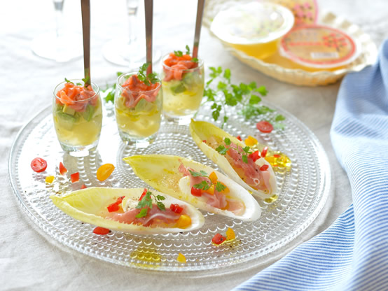アガベゼリーの簡単前菜①ももゼリーと生ハムのチコリボード